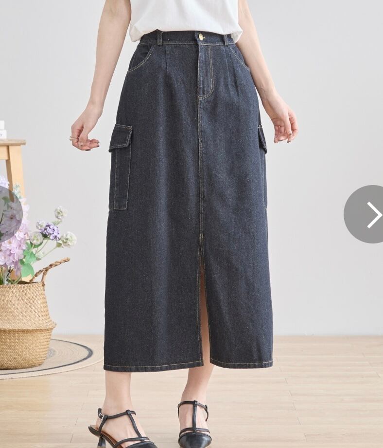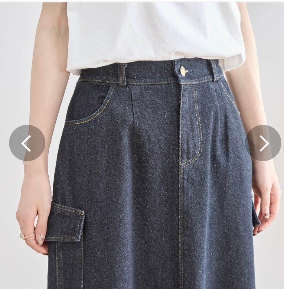 大人カジュアルを叶えるカーゴ風デザインのデニムスカート。程よいフィット感で動きやすく、シンプルなトップスやスウェットと合わせるだけで洗練されたカジュアルスタイルが完成します。 【サイズ】 総丈:86.5cm ウエスト幅 : 34cm 裾幅 : 56cm