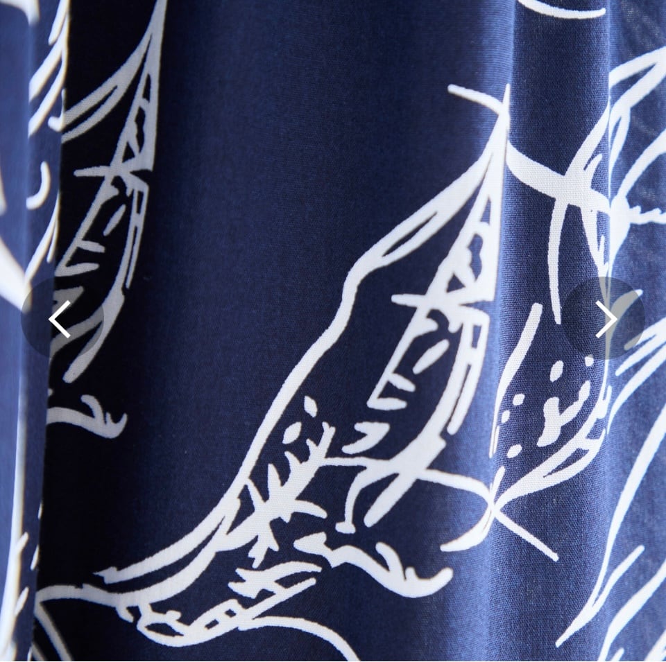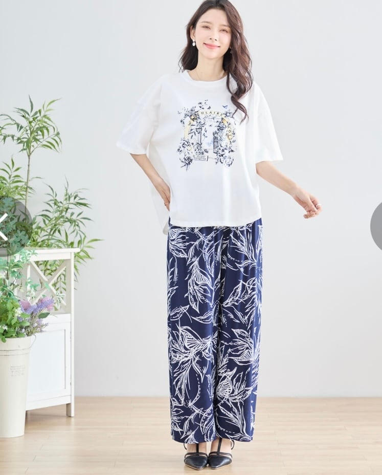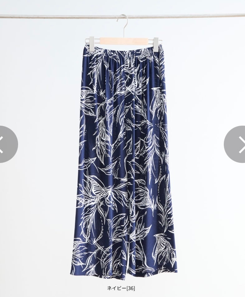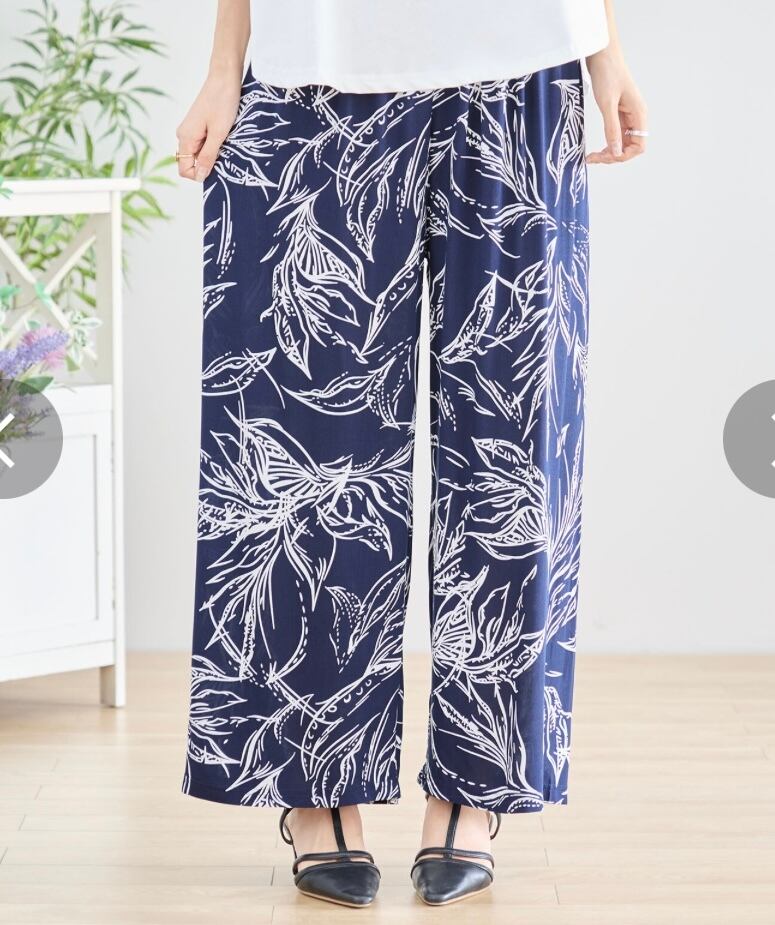 爽やかなネイビーベースに白のリーフ柄をあしらった、涼しげな印象のイージーパンツ。ドローイング風の葉模様が軽やかに舞い、夏らしい抜け感を演出。ウエストはゴム仕様でリラックス感がありながらも、すっきりとしたシルエットで美脚効果も期待できます。Tシャツやブラウスとの相性抜群で、リゾートからデイリーまで幅広く活躍します。