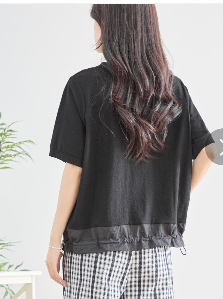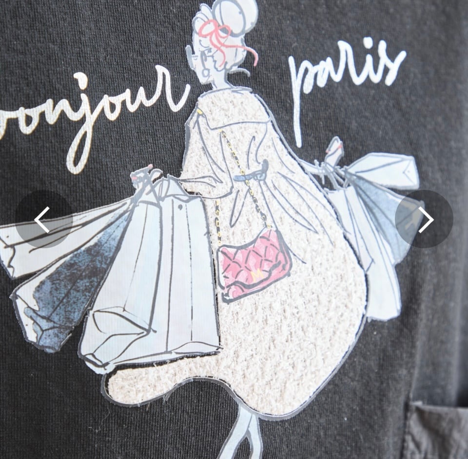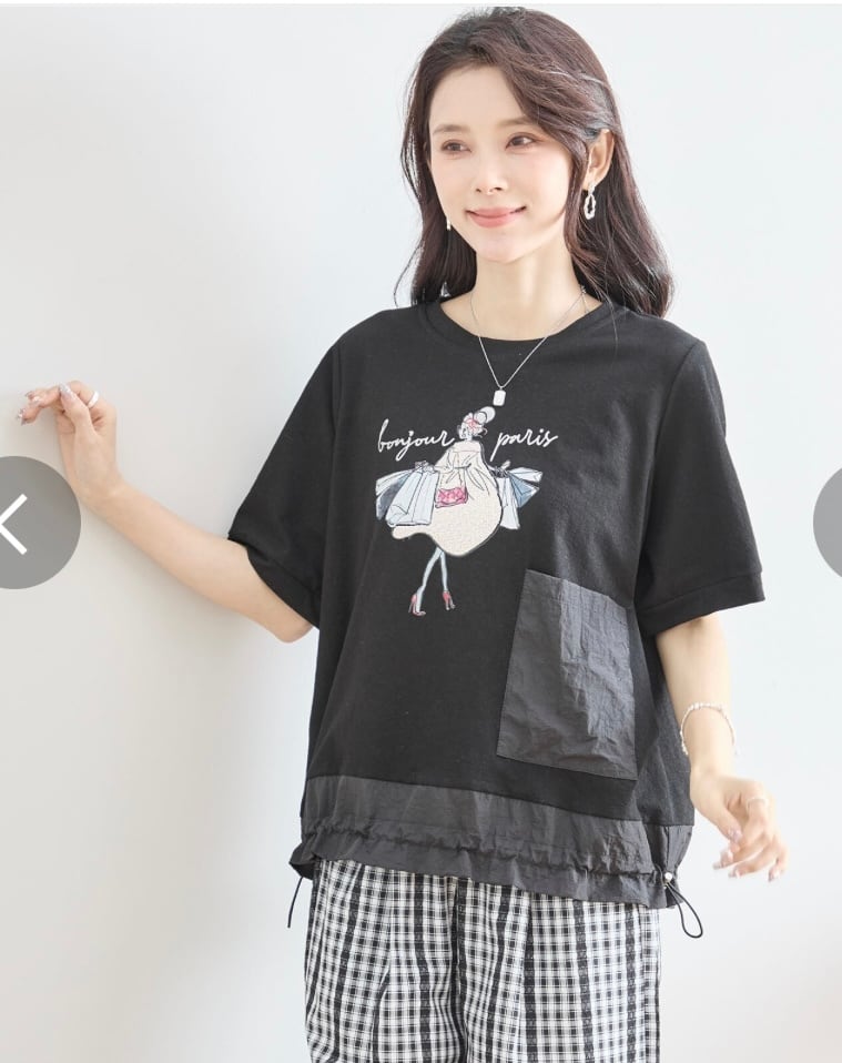 ショッピングバッグを手に颯爽と歩くパリジェンヌのグラフィックが目を引くTシャツ。異素材の切り替えヘムと立体的なプリントディテールが、シンプルながらも華やかな印象に。裾のドローストリングでシルエット調整も自在。ラフに着られて、遊び心も忘れない一枚です。