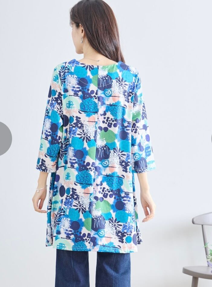 水彩画のようににじんだタッチと手描き風モチーフが印象的な、アート感溢れるチュニックトップス。ブルーを基調に、抽象的な花柄や丸モチーフをランダムに散りばめ、爽やかな遊び心を演出。軽やかな素材感と7分袖で、涼やかな着心地を叶えながら、パンツ合わせでもバランス良く決まるAラインシルエットです