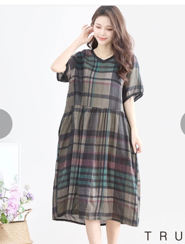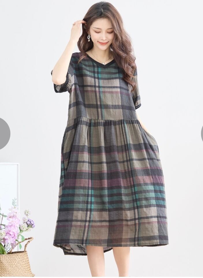 【L〜LL】チェック柄Vネックコットンワンピース