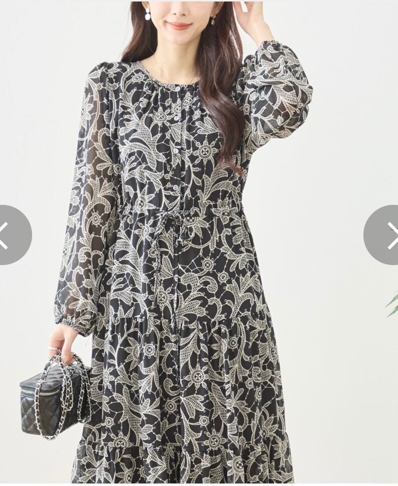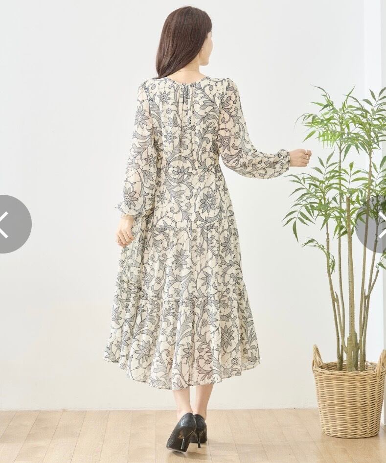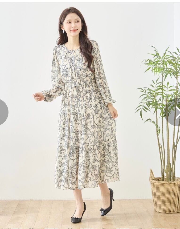 繊細なラインタッチのフラワー柄を全面にあしらい、上品で落ち着いた印象に仕上げたデザイン。ウエスト切替から広がるシルエットが自然なメリハリを生み、女性らしい立ち姿を演出します。程よい透け感が軽やかさを添え、季節感のある着こなしが楽しめます。