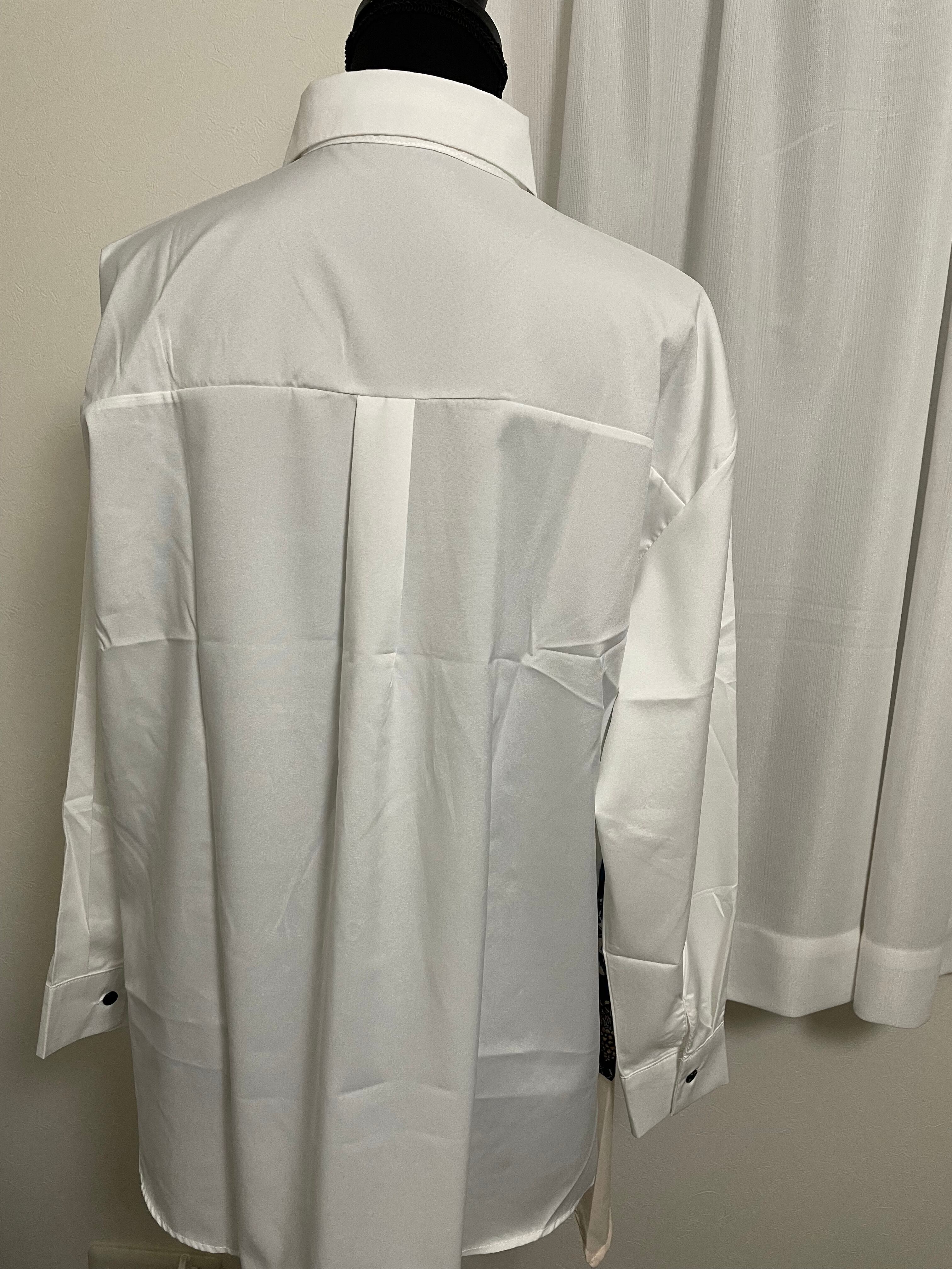 デザインシャツ スカーフモチーフ アシメデザイン 長袖 カジュアル。華やかなスカーフモチーフがポイントのおしゃれなデザインシャツ。アシンメトリーなデザインで、普段のコーディネートにひと工夫加えることができます。長袖で1枚で着るのはもちろん、羽織りとしても活躍する優れものです。シンプルなボトムスと合わせて、ついつい気分が上がる一枚に。